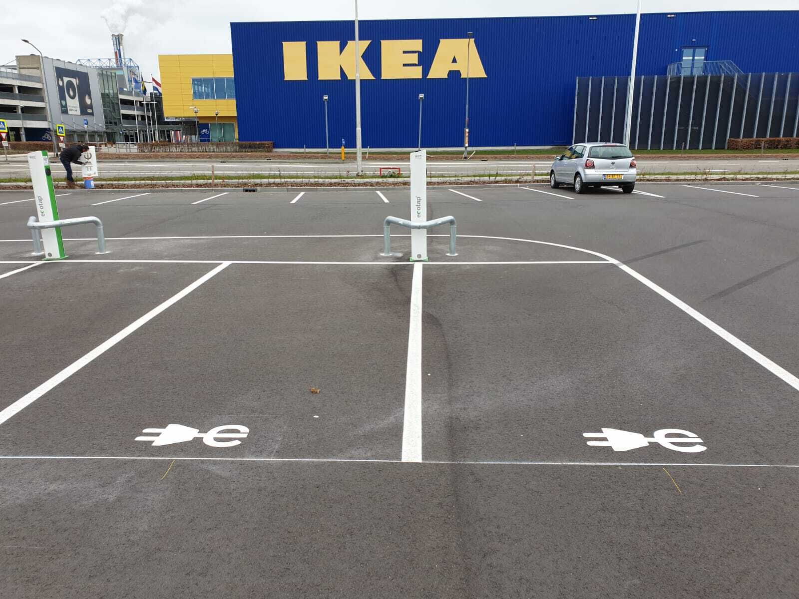 Het aanbrengen van een wit E-laad logo in wegenverf. Diverse maatvoeringen zijn hierin mogelijk. Het aanbrengen van het logo geschiedt door onze professionals, u dient enkel de ondergrond grondig te reinigen.