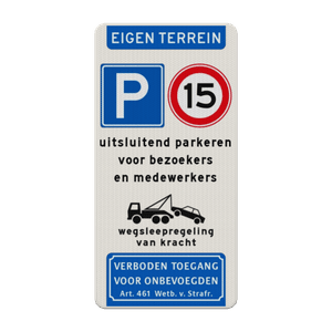 Parkeerborden op eigen terrein moeten aansluiten op de geldende situatie. Dus is het verboden te parkeren, en zo ja: geldt dat voor iedereen, of zijn medewerkers en/of bezoekers uitgesloten? En wat is de consequentie: een wegsleepregeling of wielklemregeling? Is het terrein verder verboden voor onbevoegden? En als het even kan wil je daar ook nog jouw bedrijfsnaam- of logo bij hebben staan. En dat alles gecombineerd op één bord, wat niet alleen gunstig is voor de prijs, maar ook nog eens heel wat beter voor het milieu!